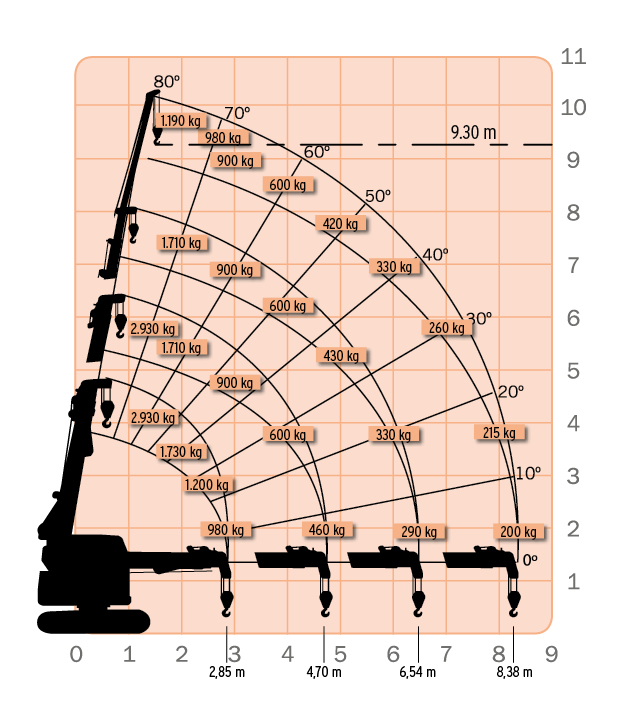 Promień roboczy maks. 8,38 m x 200 kg Wysokość podnoszenia maks. 9,3 m x 1190 kg Wymiary maks. 4020 x 1740 x 2495 mm