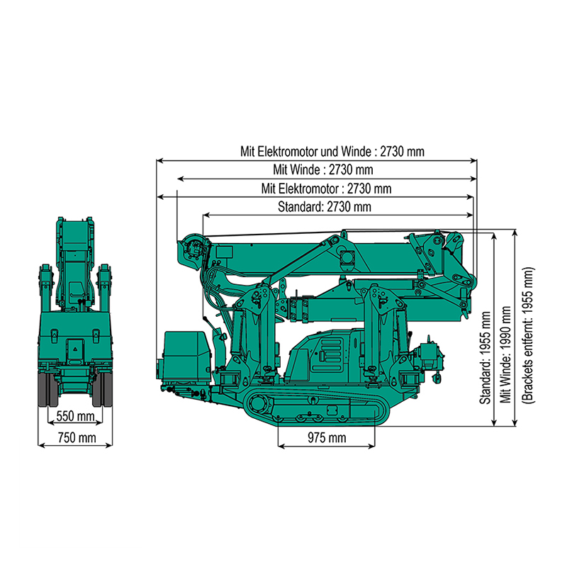Dł. x szer. na podłożu: 975 mm x 200 mm (wymiary gąsienicy) Nacisk na podłoże: 0,54 kgf / cm2 (0,61 kgf / cm2 silnik + wysięgnik) |