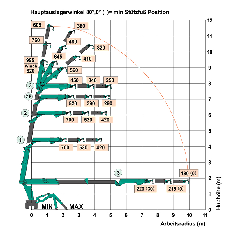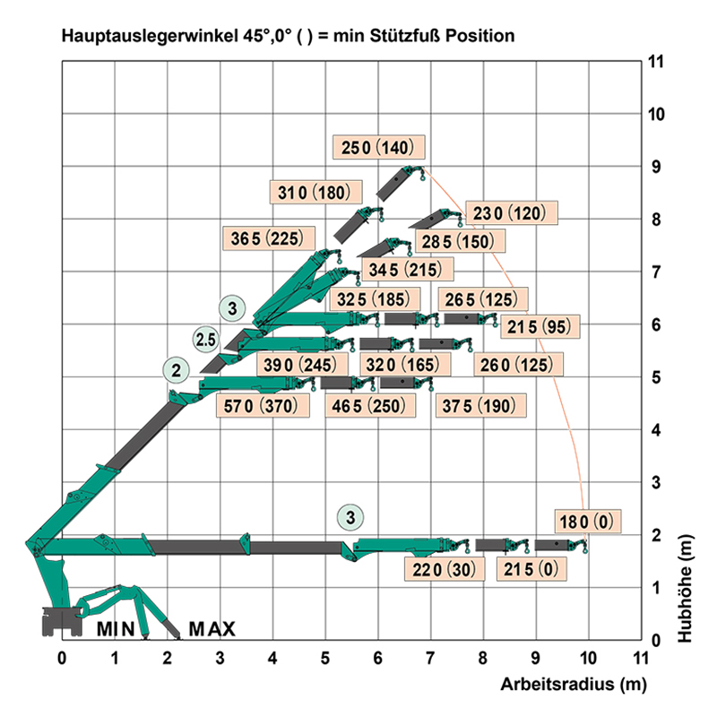 Prędkość: 3,44 m / 15,5 s [0,22 m /s] Typ wysięgnika: w pełni automatyczny, 3-stopniowy, teleskopowy wysięgnik pentagonalny (2 i 3 sekcja wysuwają się jednocześnie) Kąt wysięgnika: 0º – 80º
